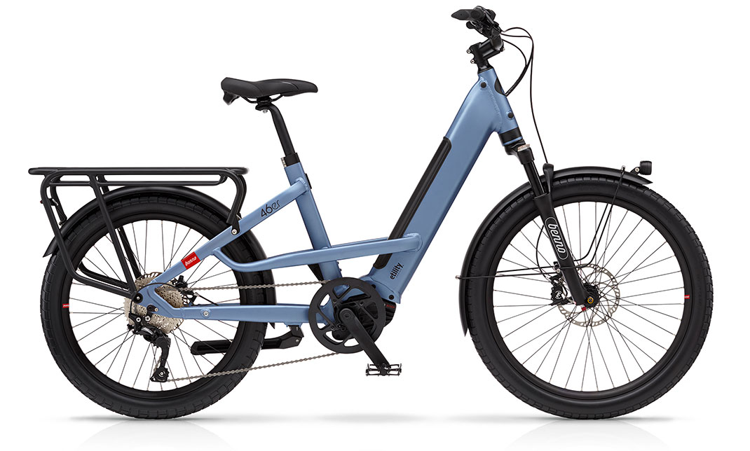 The 46er is the same length as a regular bike. And that’s where all similarities end. We ditched convention and added capability. Enough to make any cargo bike sweat. And gave it a sporty ride and front suspension. This unequaled combination of ride and capability starts with unequal wheels. 26″ in the front for extra comfort and control, and 24″ in the back for strength and a lower center of gravity. All powered by the Bosch CX / Speed and a 500Wh intube battery. Born of true Etility® Design, the 46er is reshaping the future of the ebike. For Benno Bikes and the industry.